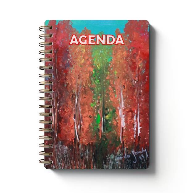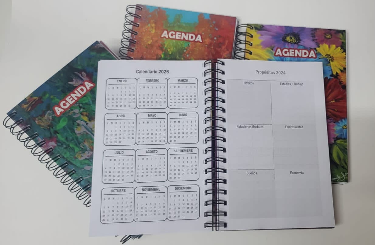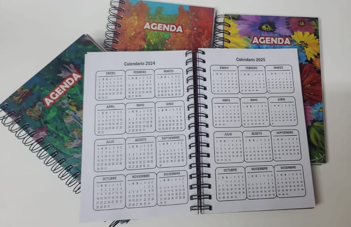 Agenda pasta dura con planificador y calendario anual 2024-2026. Tamaño A5 vista de dos días. Con secciones de finanzas, objetivos, prioridades, entre otros. 3 diseños distintos de portada y cada mes una portada distinta de pinturas en acrílico.