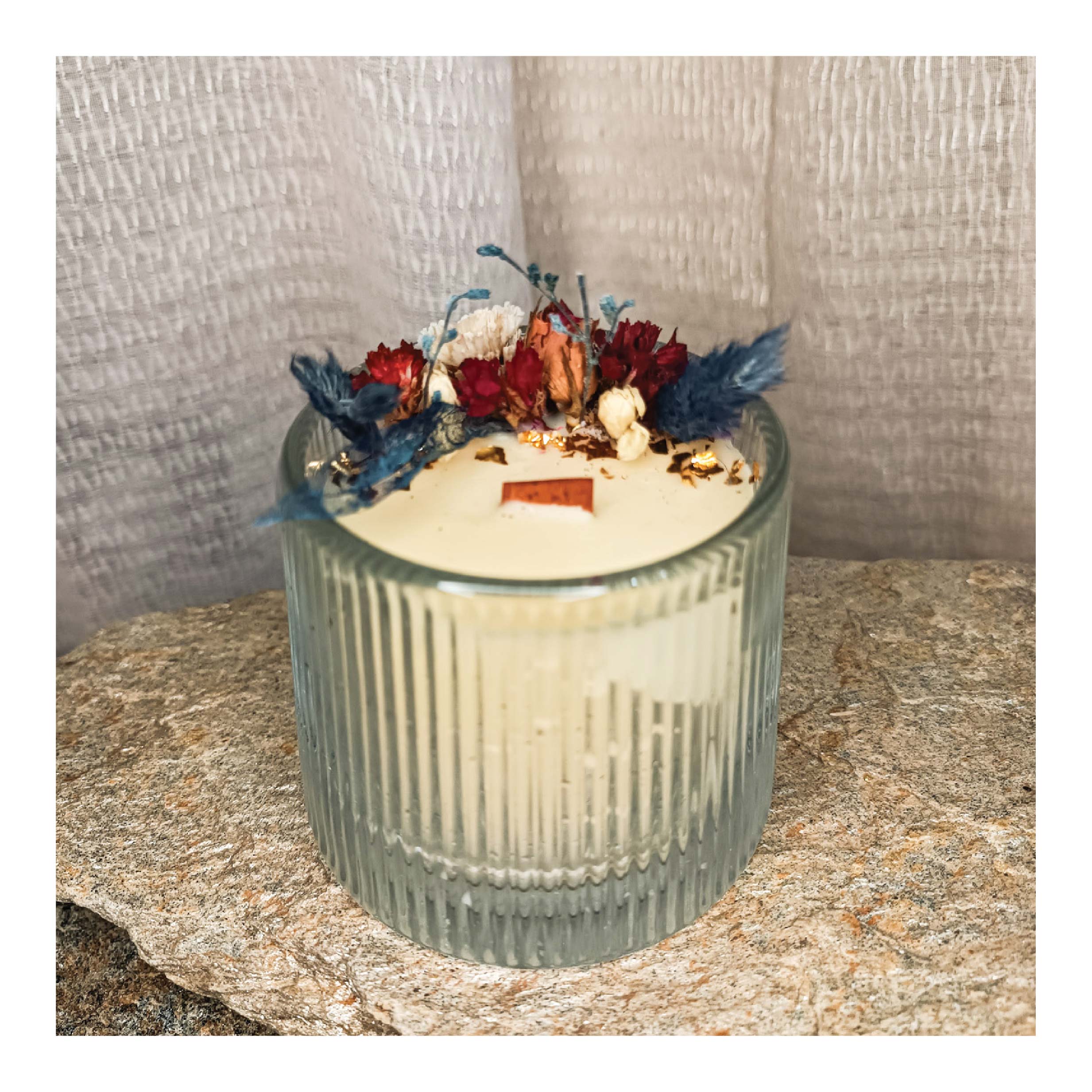 Un viaje de belleza y serenidad con nuestra vela, que es una sinfonía de eco-amigabilidad, con un pabilo de madera e ingredientes naturales que brindan una fragancia floral envolvente. El vaso de cristal, ingeniosamente diseñado para girar suavemente, crea un juego de luces y sombras que refleja la belleza de las flores y sus delicados detalles.