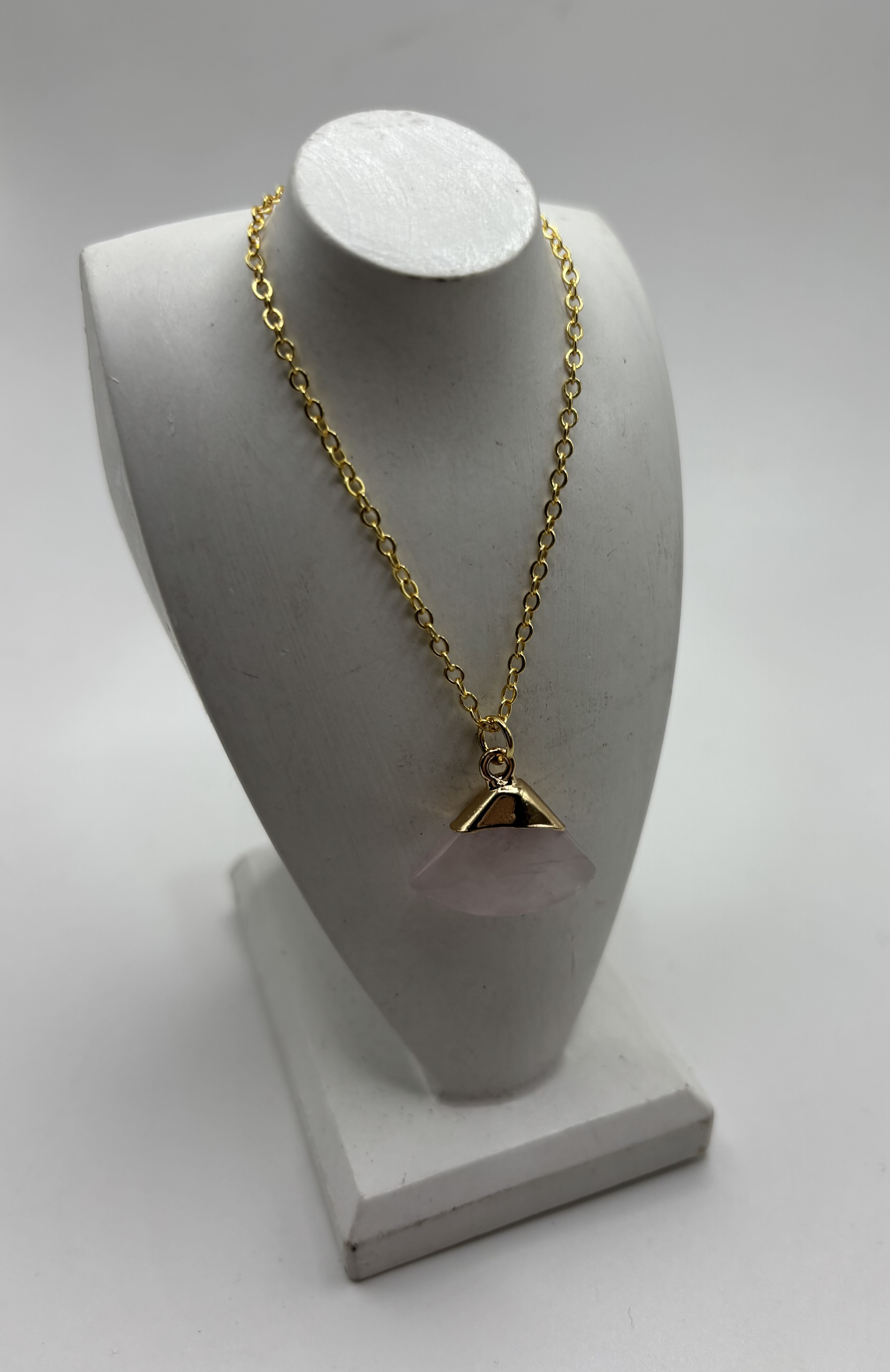 Hermoso dije de piedra natural de cuarzo rosa en forma de pendulo en cadena de oro laminado
