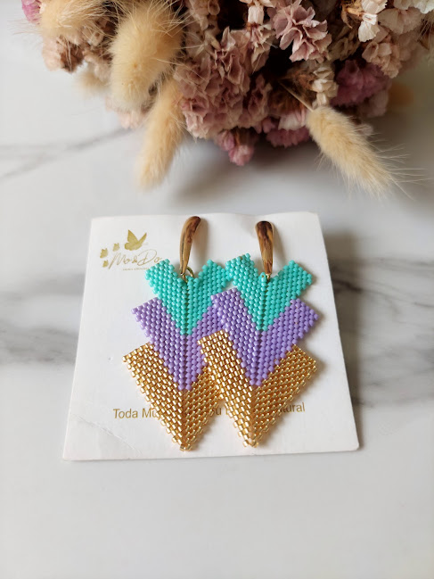 Arete flechas tejido con miyuki morado, aqua y dorado