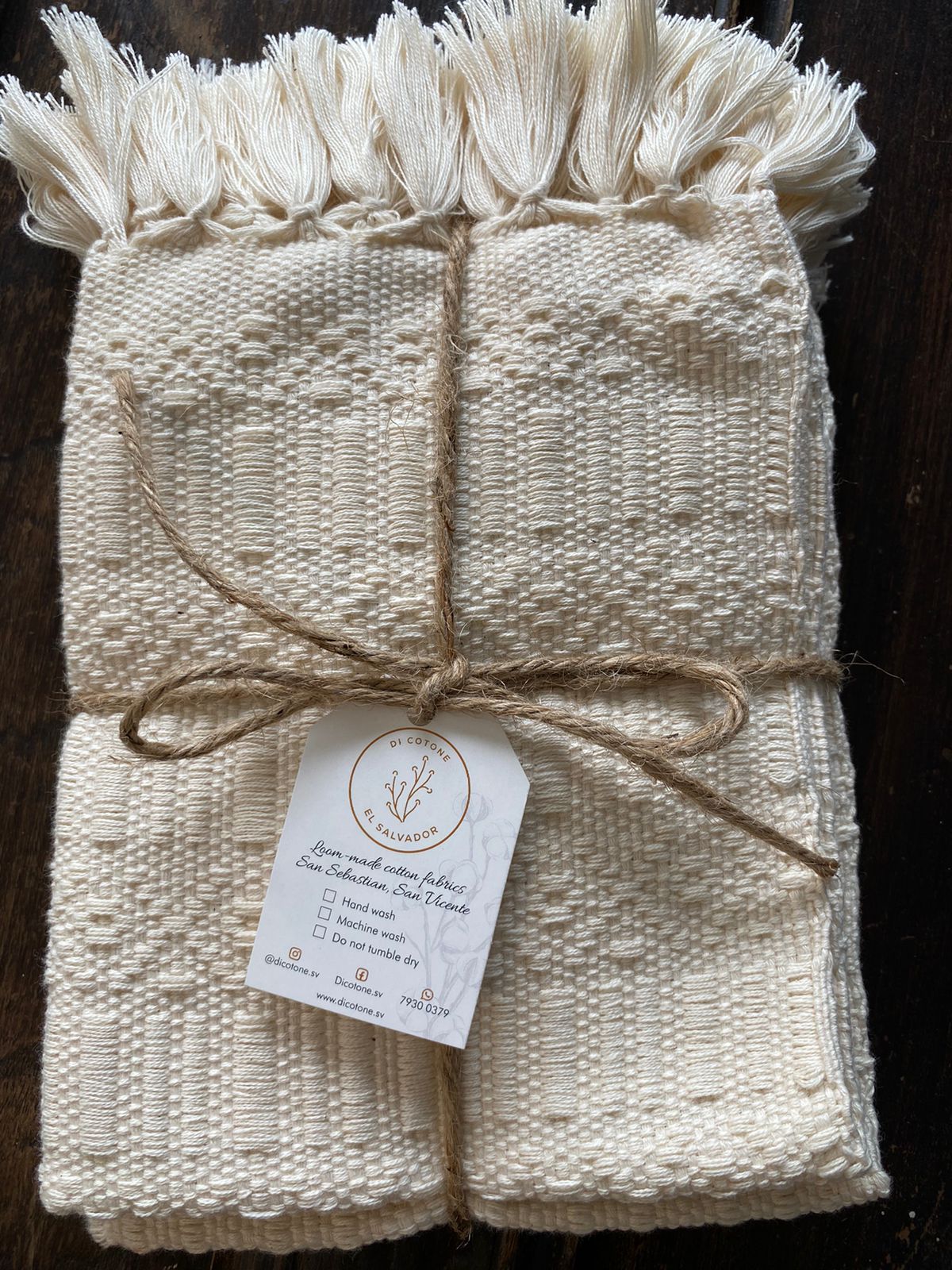 Juego de cuatro manteles individuales artesanal material algodón color crema.