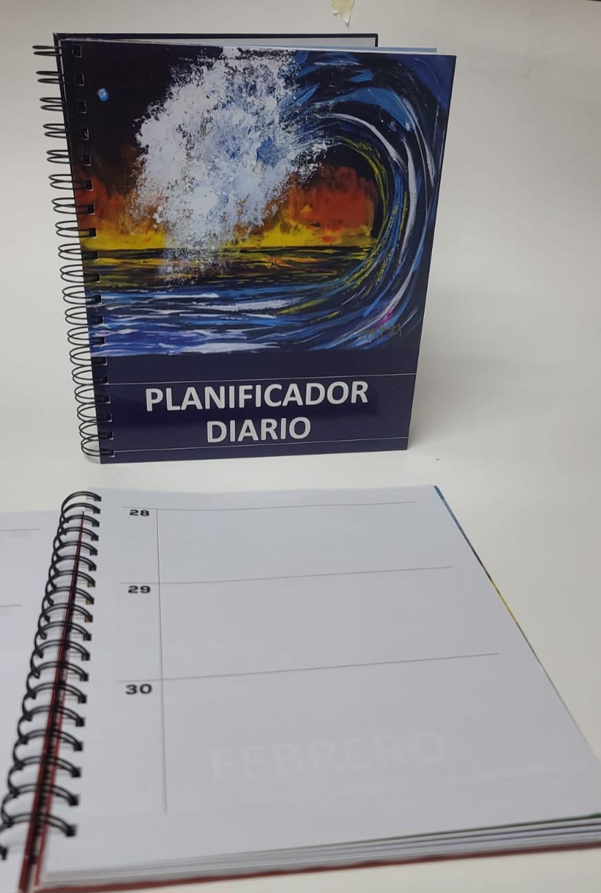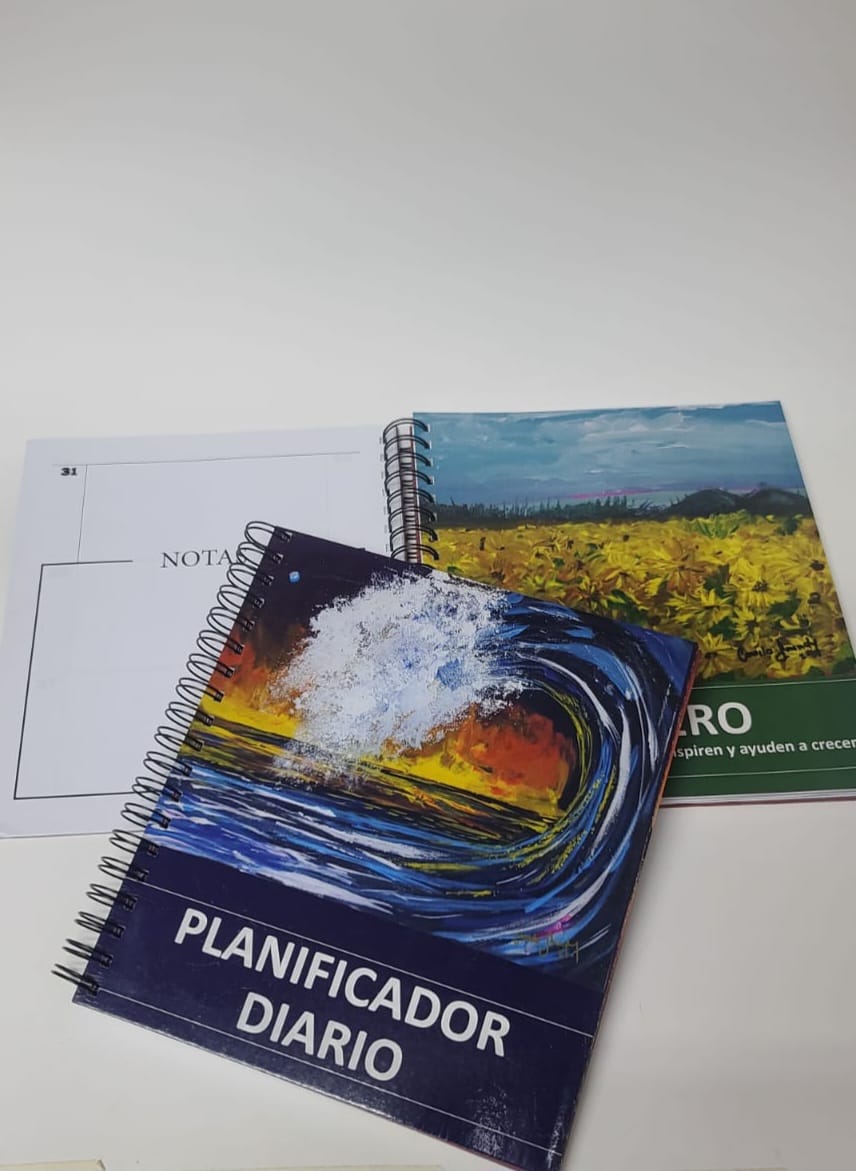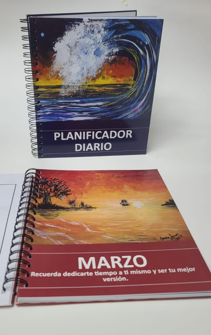 Planificador tipo agenda en pasta dura con espiral, tamaño 8.32 x 9.55 ´´ Contiene en cada portada mensual una de mis printuras en acrílico. 3 días por hoja y espacio para notas.