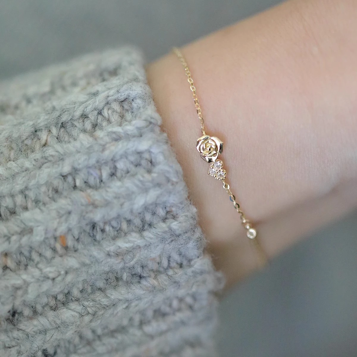 Pulsera Elegante de Cadena Delgada con Corazón de Amor y Flor de Rosa Incrustada