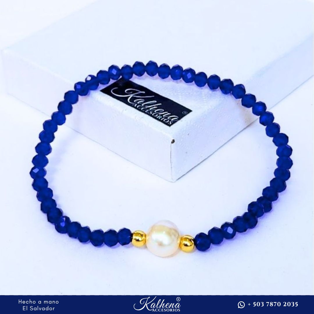 Pulsera perla cultivada entre balines oro laminado y cristales checos azul