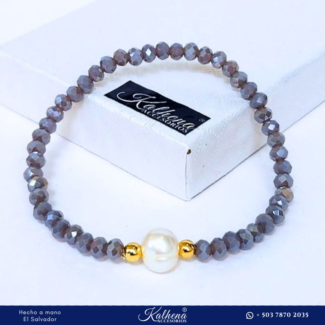 Pulsera perla cultivada entre balines oro laminado y cristales checos gris