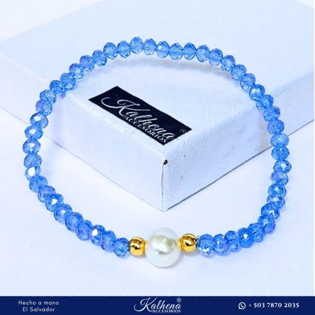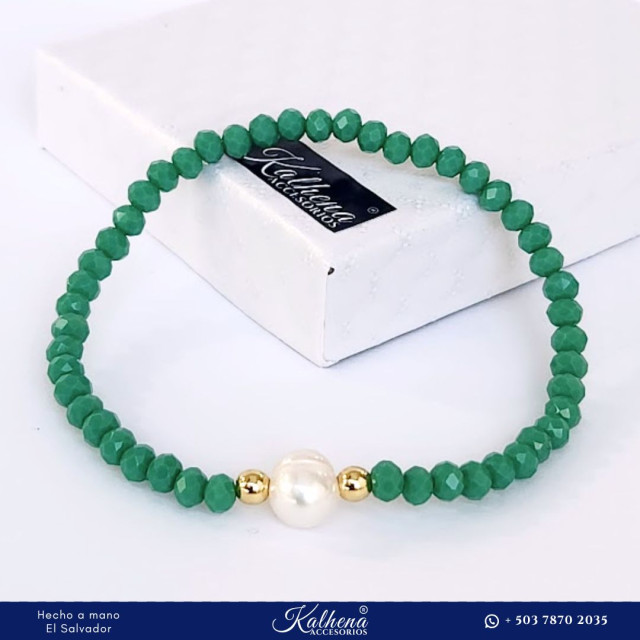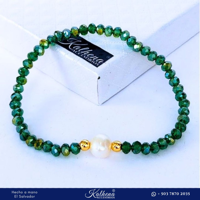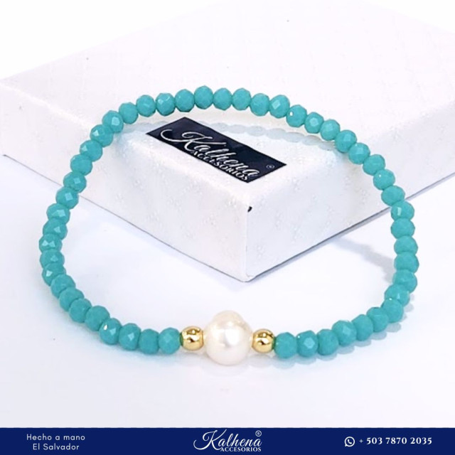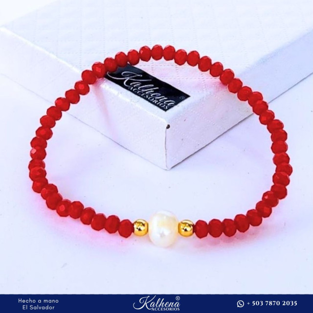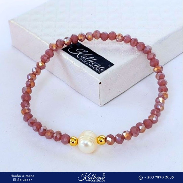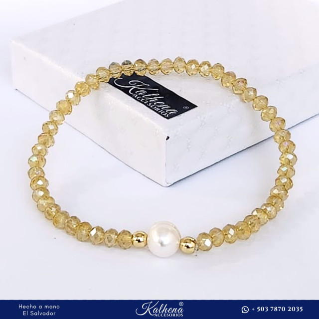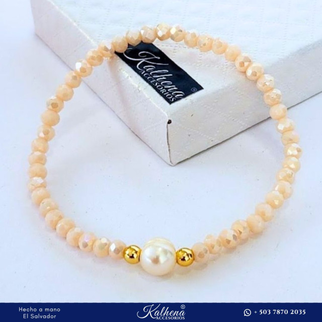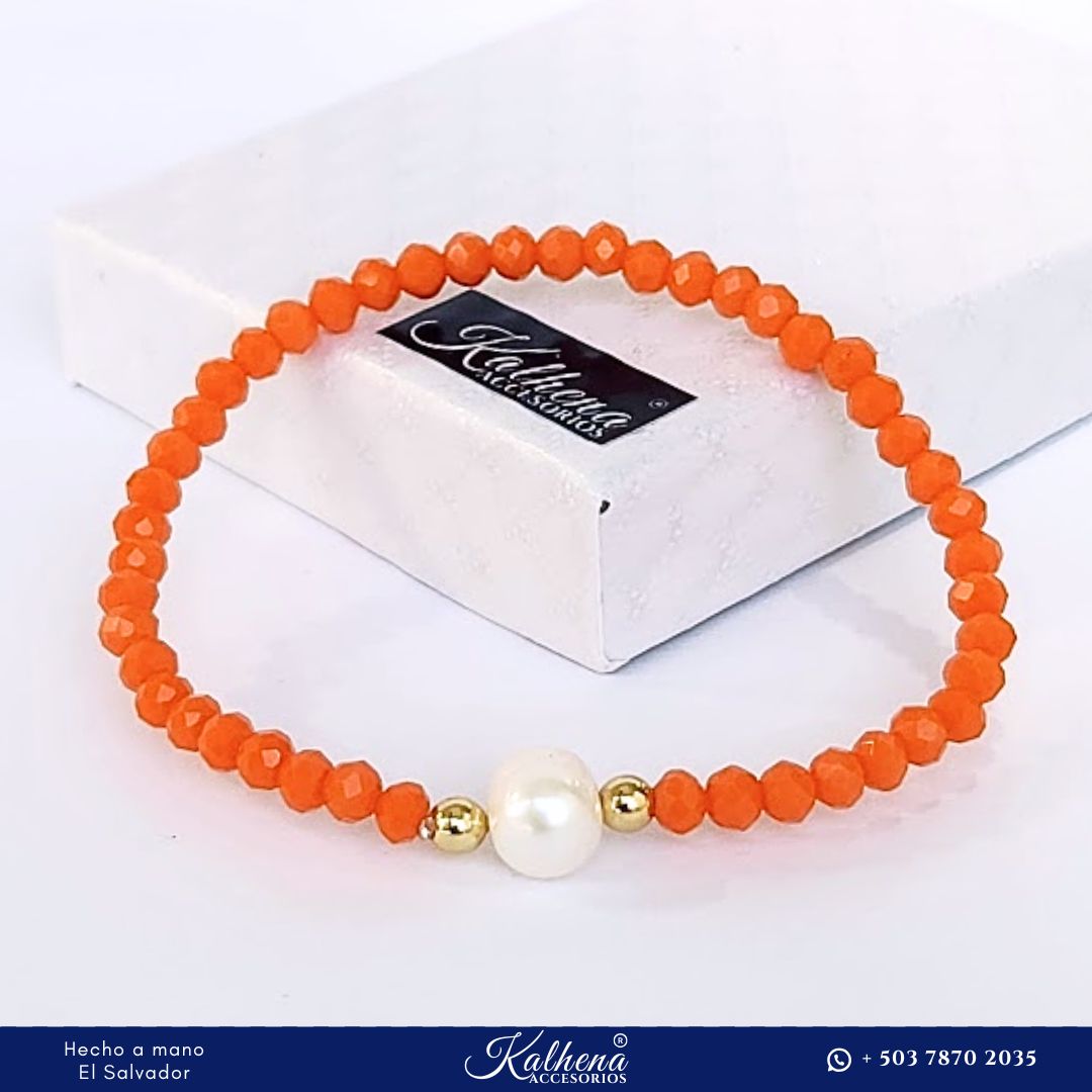 Pulsera perla cultivada entre balines oro laminado y cristales checos naranja