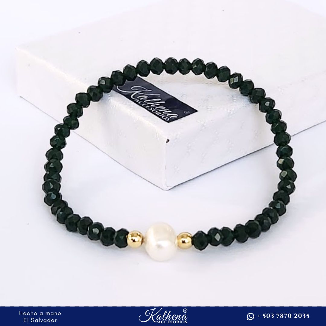 Pulsera perla cultivada entre balines oro laminado y cristales checos negro