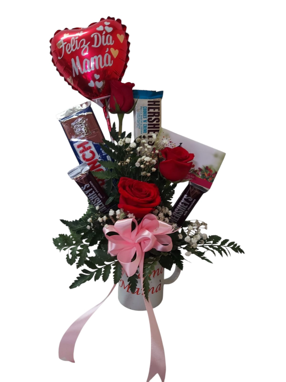 TAZA DE CERAMICA ADORNADA CON 3 FRESCAS ROSAS, FLORES DE COMPLEMENTO, INCLUYE 4 DELICIOSOS CHOCOLATES DE DIFERENTES TAMAÑOS Y PRESENTACION ADEMAS DE 1 MINO GLODO DE MAMA, DISEÑO DE ACUERDO A DISPONIBILIDAD