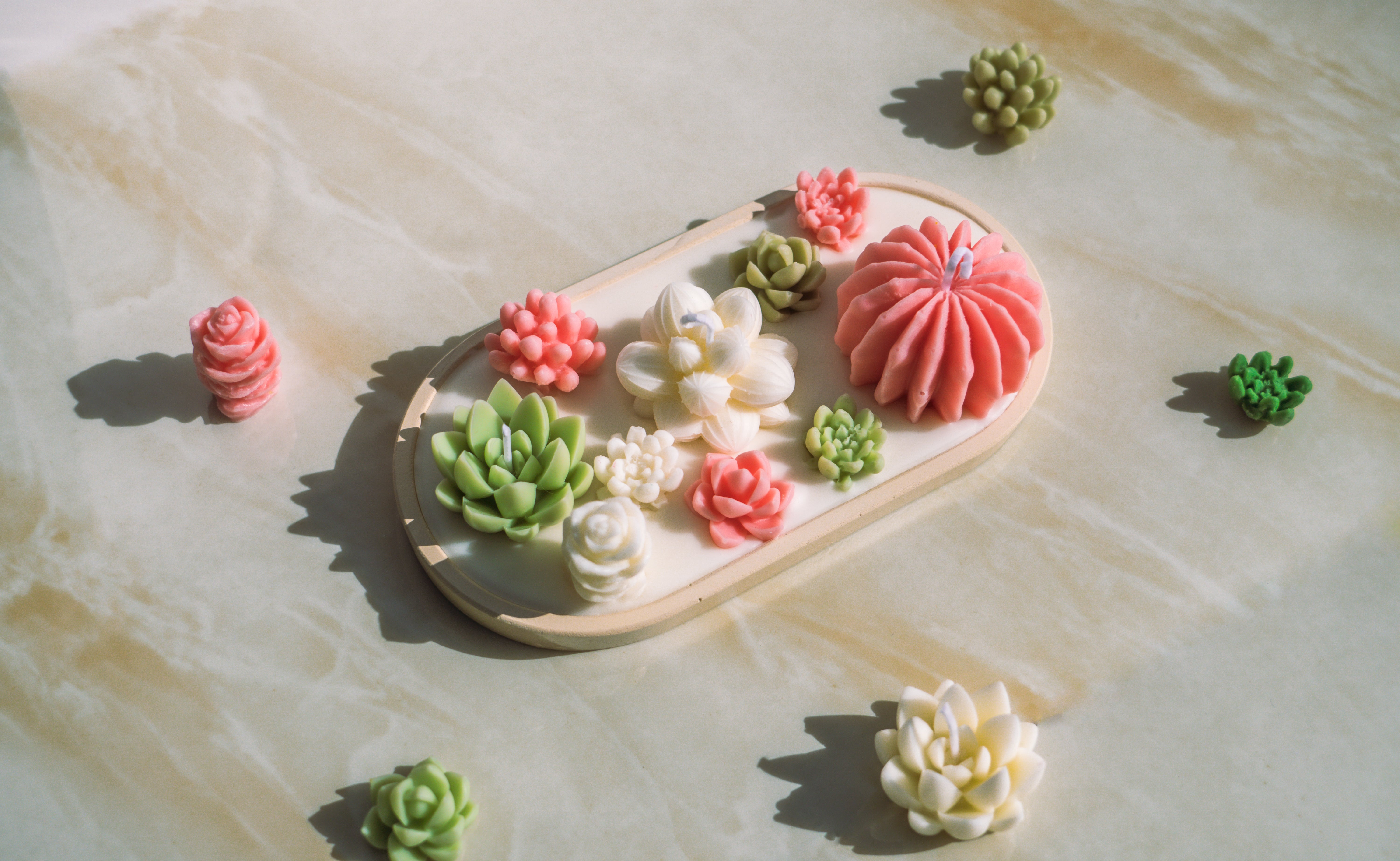 Base de cemento, de aproximadamente 18cm de largo, color marfil. Decorada con diversas piezas de cera en forma de cactus y/o suculentas.