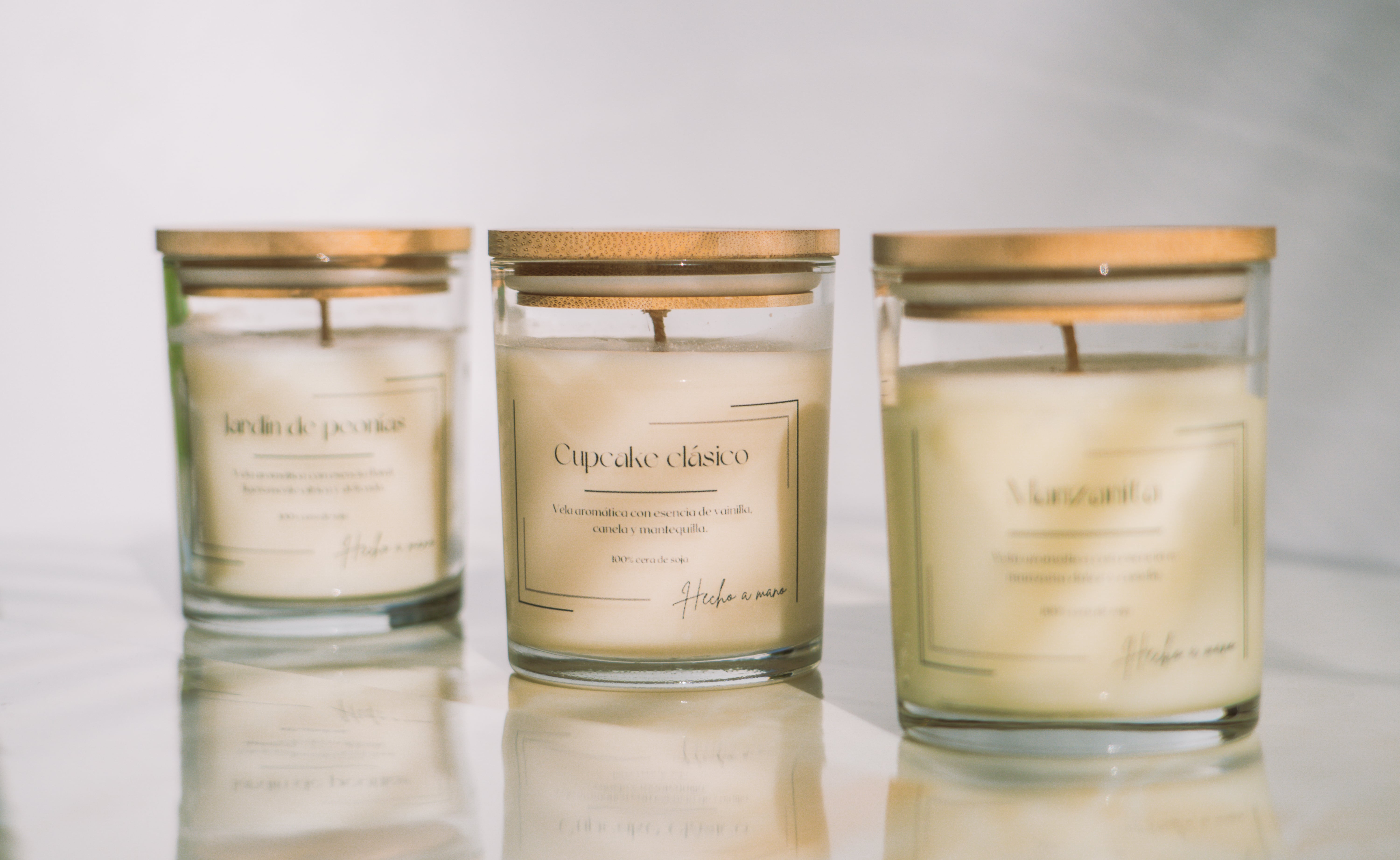 Envase de vidrio de aproximadamente 8cm de alto x 6cm de ancho, con 140gr de cera aromática.